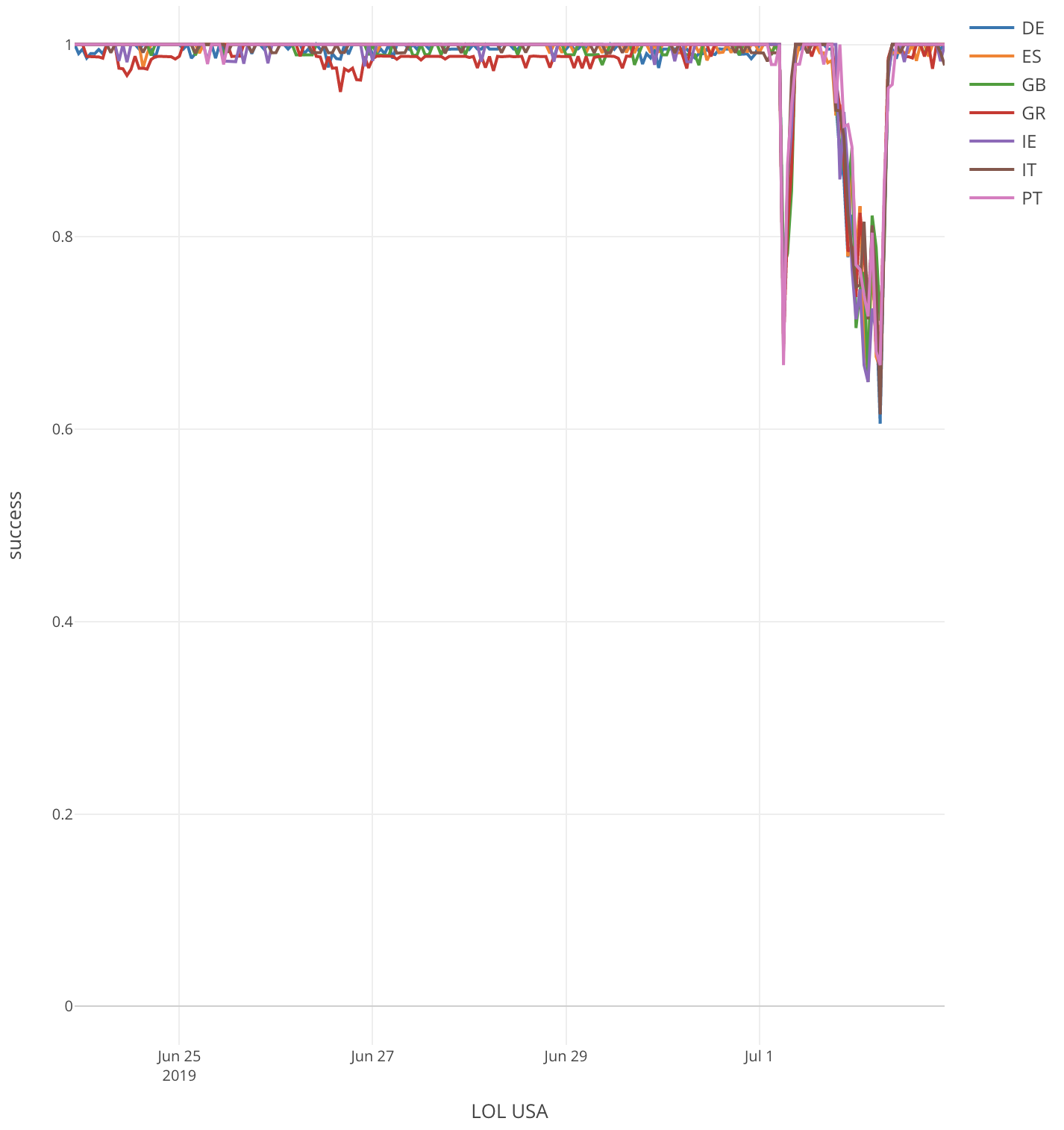 Until TFT release day, the data gathered by MedUX showed that the number of succesful completed tests against the video game servers was greater than 95%. As it can be seen in the graph below, the 1st July the servers suffered the interruption mentioned above, however, during the 2nd July morning, players have already recovered the connectivity and were able to access the game normally.