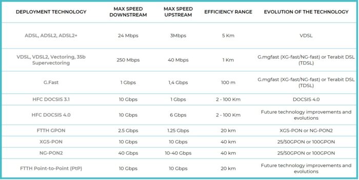 Según los estudios de la Comisión Europea, con DSL, acceso por cable, la tecnología de fibra óptica, una variedad de tecnologías de banda ancha por cable están disponibles en el mercado que garantizan servicios de banda ancha confiables. Sin embargo, sus capacidades difieren considerablemente entre ellos. Las principales características de cada tecnología se resumen a continuación para una comparación rápida de un vistazo.