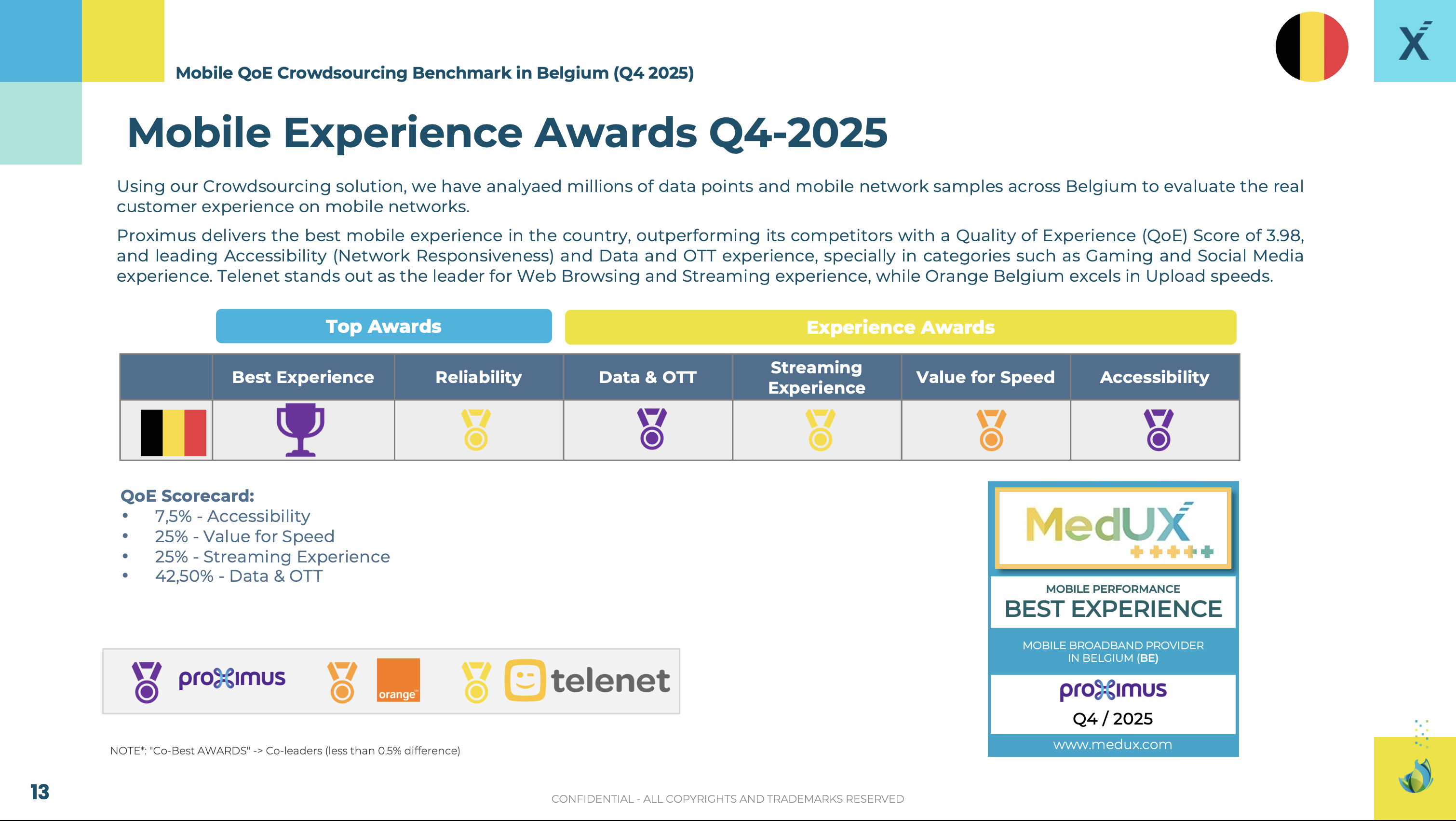 In this article, we focus on the main results of the MedUX Mobile QoE Crowdsourcing Benchmark in Belgium (Q4 2025), published in the report “Status of Mobile Quality and Experience in Belgium” (MedUX Connectivity Observatory, February 2026), as well as on the results offered by our sister company Speedchecker (Q4 2025).