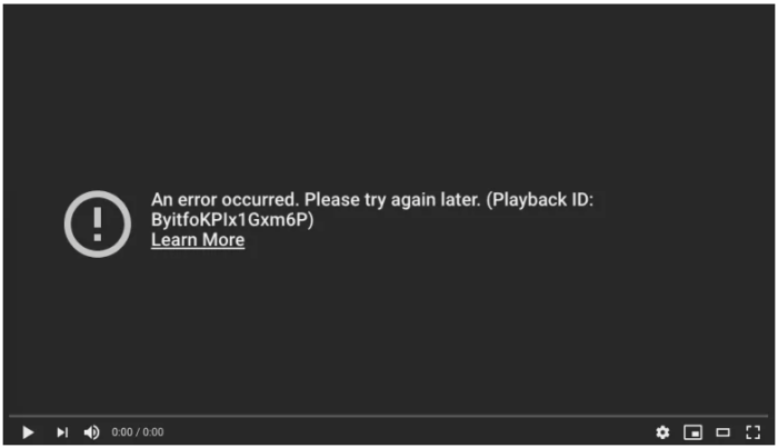 In some cases YouTube displayed an error message, stating that "An error occurred. Please try again later. (Playback ID: [alphanumeric string]) Learn more)." As of now it's not clear yet what the root cause of the issue was but we have determined the customer experience impact.